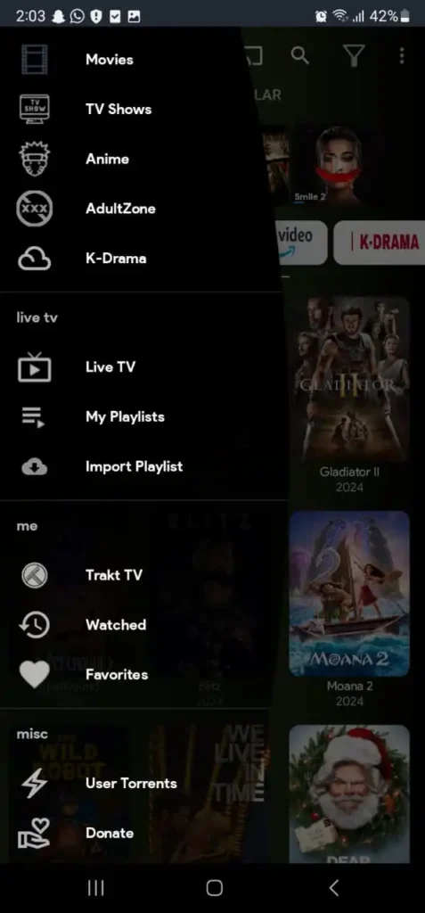 - A menu will open in front of you with different video content like movies, series, anime, and live tv.
